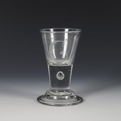 Konische Kuppa mit eingestochener Luftblase im kugeligen, massiven Kuppaboden, Balusterschaft mit eingestochener Luftblase, flacher Hutfuß mit nach unten umgeschlagenem Rand; Abriss. Auf der Wandung über einem Kerbschliffkranz eine schauseitige Floralgravur mit zwei kleinen Olivenlinsen sowie einem mit blauer Emailfarbe hinterlegten Schriftband mit der Aufschrift "Liebe ohne falscheit"