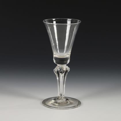 Glockenförmige, wabenoptisch formgeblasene Kuppa, gerippter Nodus, Balusterschaft mit eingestochener Luftblase, Rundfuß mit nach unten umgeschlagenem Rand; Abriss