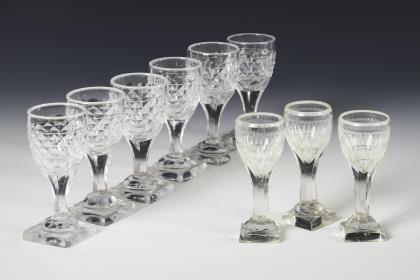 6 Gläser mit Steinelschliffband auf der Kuppa, facettiertem Schaft und quadratischem Fuß; ausgekugelter Abriss. / 3x mit Olivenschliffbordüre und Kerbschliffkranz auf der Kuppa, facettiertem Schaft und quadratischem Fuß