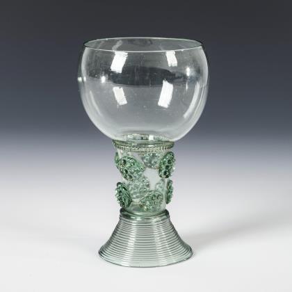 Bauchige schrägoptisch formgeblasene Kuppa, Zwackelband, zylindrischer, schrägoptischer und nach oben offener Schaft mit drei aufgelegten Beerennuppen, gesponnener Trompetenfuß; Abriss