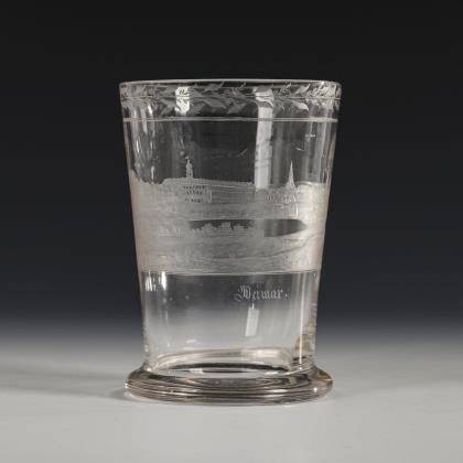 Leicht konischer Becher mit ausgestelltem Stand. Schauseitig eine Rechteckkartusche mit der gravierten und bezeichneten Ansicht der Stadt Weimar mit Blick auf das Schloss
