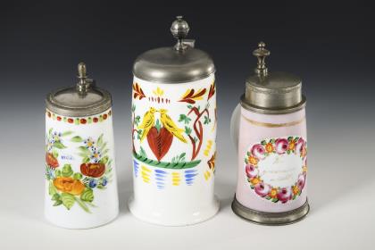 Konischer Korpus, Bandhenkel und zinnmontierter Scharnierdeckel. 1x mit der schauseitigen Aufschrift "Zum Andenken" in einer eichenblatt- und blütengerahmten Kartusche und 1x mit der Aufschrift "Denk an mich" in einem blütengerahmten Medaillon