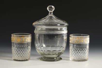 1x bauchige Dose mit facettiertem Ansatz und Rundfuß sowie Knaufdeckel. / 2x Zylinderbecher mit gesteineltem Ansatz sowie einer floral gravierten und teils goldstaffierten Bordüre