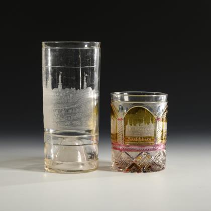 1x Zylinderbecher aus farblosem Glas mit der gravierten Ansicht von Hirschberg im Riesengebirge. / 1x Zylinderbecher aus farblosem, teils gelb, blau und rosa gebeiztem Glas mit Kerb-, Steinel- und Linsenschliff: in vier Kartuschen gravierte Ansichten von Hirschberg, Warmbrunn, Fischbach und dem Schweitzerhaus