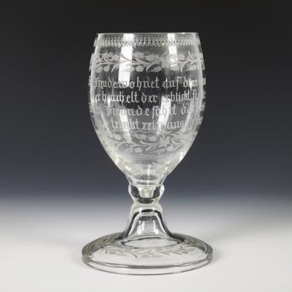 Ovoide Kuppa, konischer Nodus, glockenförmiger Rundfuß. Auf Kuppa und Fuß gravierte Ähren- und Blütenbänder sowie eine Olivenlinsenbordüre mit Stecknadelblumen an der Mündung, schauseitig der gravierte Spruch "Die Freude wohnet auf dem Grunde / Wer heuchelt, der erblickt sie nie / Drum Freunde führt das Glas zum Munde /Und trinkt rein aus so schmeckt ihr sie. "