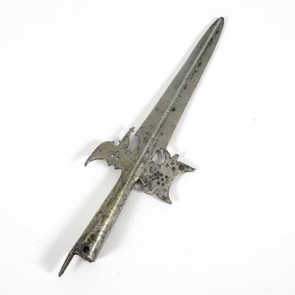 Klinge und Tülle aus einem Stück geschmiedet. Lanzenteil mit Mittelgrat, Flügelteile mit Lochmuster. Verlängerung für Schaftbefestigung abgebrochen