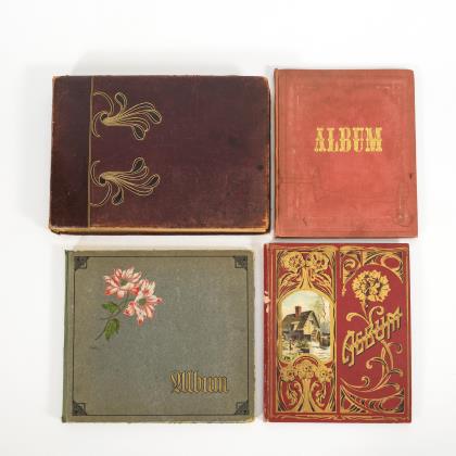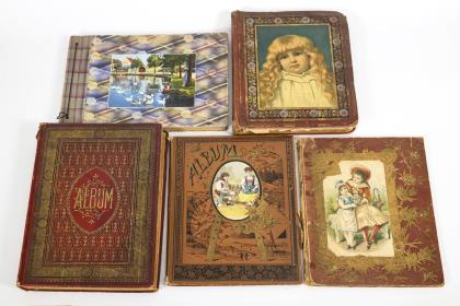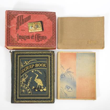 Dickes "Album pour Images et Chromo" mit rotem Leineneinband: Teils französisch beschriftet, teils Werbung. / Großes Album mit geprägtem grünen Ledereinband "Scrap Book": Beiliegender Kaufbeleg aus den USA. Innen 1883 datiert, einige Seiten mit Handschrift. Teils große Oblaten (31 x 24 cm), teils englisch beschriftet, 1 Kinderfoto aus Harrisburg. Album defekt, mit Wasserschaden am unteren Rand, hier auch die Bilder betreffend. / Bedrucktes Album mit Leineneinband: Teils große Oblaten (20 x 29 cm; "Illert Reliefbilder"), einige Offsetdrucke. / Sammelalbum "Gerold" als hellbraunes Album vollständig mit Tierbildern (Farblithografien) beklebt