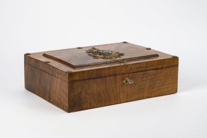 Schatulle mit Reliefapplik auf dem Scharnierdeckel: Frau mit Wappenschild (Gravur "GS"). Innen herausnehmbare Fachung über Hohlfach sowie Spiegelglas im Deckel