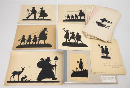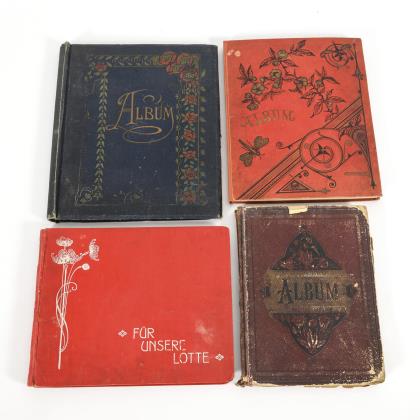 Luxuspapiere bzw. Glanzbilder verschiedenster Themen. Marmorierter Halbledereinband innen mit handschriftlicher Widmung von 1901. Auf den Pappseiten zumeist Tiere, Kinder, auch Eisenbahn und Militär ("Ostasiatische Jäger-Kompanie" mit "Generalfeldmarschall Graf Waldersee" bzw. "2. Königl. Sächs. Ulanen-Regiment No 18 Leipzig!). / "Scraps" betiteltes Album u.a. mit 2 Kampfszenen zwischen Indianern und Weißen. / Leinenalbum mit leinenbezogenen Seiten zumeist Farblithografien, teils englisch beschriftet. / Dickes Briefmarkenalbum mit lose eingesteckten Bildern