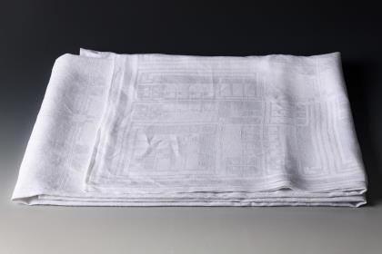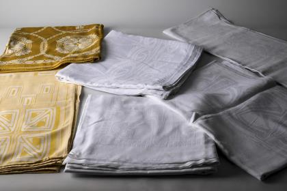 Tafeltuch wohl aus Halbleinendamast mit architektonisch anmutender Bordüre und Quadratmusterung in der Mitte; 2x rot gesticktes Monogramm "FB". Wenige Flecken, 1 Loch 5 mm, 1 etwas ausgezogener Faden. 125 x 290 cm. / Großes Tafeltuch aus feinem Stoff mit vegetabil verschlungener Musterung und mit am Hohlsaum angenähtem, etwas stärkeren Rand; weiß gesticktes Monogramm "ED". 2 Flecken. 164 x 334 cm. / Großes Tischtuch mit Bordüre aus abstraktem Jugendstil-Muster und blumenartigen Rosetten in der Mitte; großes weiß gesticktes Monogramm "KR". 1 Loch 5 mm, Flecken am Rand. 160 x 190 cm. / Tischtuch mit stilisiert fächerförmigem Muster in der Bordüre, dass sich verkleinernd in der Mitte mit Streifengliederung wiederholt; weiß gesticktes Monogramm "CM". 122 x 148 cm. / Quadratische, weiß/senfgelbe Tischdecke mit stilisierten Rosenmedaillons als Bordüre sowie länglichen Feldern in der Mitte; weiß gesticktes Monogramm (MB?). 150 x 150 cm. / Annähernd quadratische weiß/gelbe Tischdecke in der Art von Peter Behrens mit abwechselnd geometrischem Rapport; aufwendig weiß gesticktes Monogramm (BG?). 127 x 119 cm