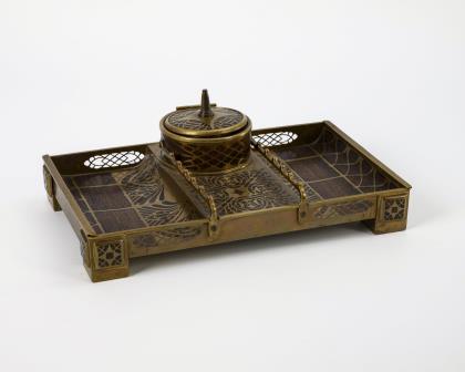 Reich ornamental verziertes Schreibzeug mit zentraler Dose als Tintenfass auf dem erhöhten Mittelfeld sowie seitliche Stiftablagen