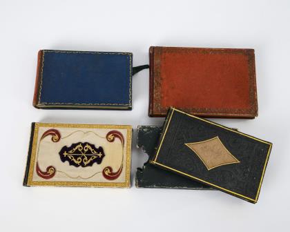 Buchförmige Freundschaftsalben ("liber amicorum"). Rote Schatulle mit kolorierter Genre-Lithografie im Deckel. Zahlreiche Blätter (1840-1844) zumeist aus Neustrelitz, Mirow, Woldegk, Berlin usw.. / Blaue Schatulle mit rotem Buchrücken. Zahlreich Blätter (1843-1847) fast ausschließlich aus Halberstadt, darunter 8x mit Aquarellen (2x trinkende Studenten, einige Blumen und Freundschaftsaläre) und 2 x mit Bleistiftzeichnungen. Beiliegend 2 Quittungen für Grabstellen in Glogau von 1912. / Im grünen Schuber Schatulle mit Deckel-Stahlstichen vom Tegernsee und von Nymphenburg sowie unbeschriebene Original-Blätter mit Goldschnitt. / Reich applizierte Schatulle mit wenigen beschriftete Blättern (1843-1857) zumeist aus Merseburg sowie 3 beiliegende Taufbriefe