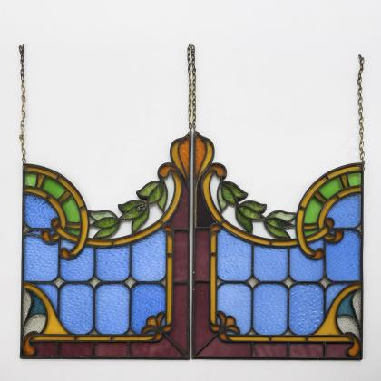 Spiegelbildlich gearbeitete "Bleiglasfenster" mit zentraler Quaderung in blau und violetter Bordüre; der obere geschwungene Abschluss mit Zweig und Bogenschwüngen