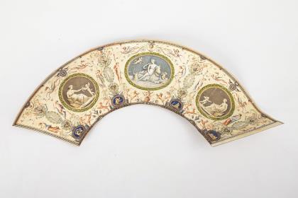 Einseitig vollflächig bemaltes Fächerblatt mit Grotesken-Ornament, dass von Göttern, Amoretten und Fabelwesen belebt wird. 3 eingestellte Medaillons mit Kranzrahmungen: Europa auf dem Stier, flankiert von 2 Szenen mit der Venus und dem Amorknaben