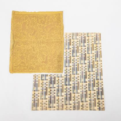 Barocker Golddruck des 18. Jh. auf feinem Lumpenpapier mit Bugfalte: Die Fläche ausfüllendes Rankenornament mit Jagdszenen (Jäger bei der Hirschjagd und Sauhatz). Rückseitig mit Bleistift französisch beschriftet: "pour la chaire pour ... vert et rouge C(omte?) de Le Massois". Wasserschaden und Knickspuren am Rand, leichtere Alters- und Gebrauchsspuren. Blatt 35 x 42 cm. / Dazu ein dreifarbiges Tapetenstück des 20. Jh. mit geometrisch verzahntem Muster in Verläufen. Einige Alters- und Gebrauchsspuren. Maximal 44 x 50 cm