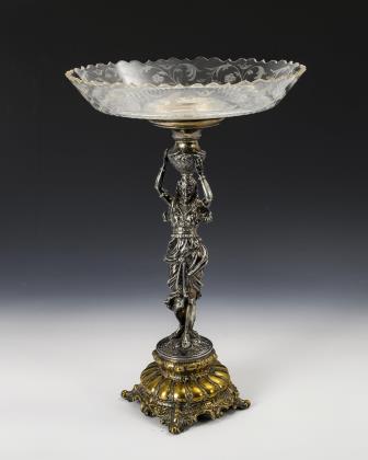Goldfarbener, godronierter Sockel mit reicher Reliefzier im Barock-Stil. Geschwärzte Standfigur einer Schönheit, die mit erhobenen Händen eine Vase auf dem Kopf trägt, die als Halterung für die Glasschale dient. Schale mit Facettenschliff am Boden und feinem Rankenschliff auf der Wandung mit passig geschweiftem Rand