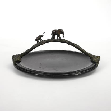 Flache Steinschnittschale mit floral geformtem Griff, auf dem zwei Elefanten laufen