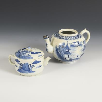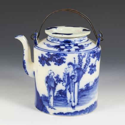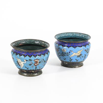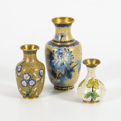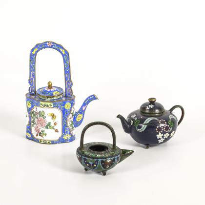 Hellblaue Kanne mit Prunus-Blüten und Rosen als dekorative Malerei, hoher Henkel. (H 21 cm). / Zwei dreibeinige Kännchen in Cloisonné-Technik. Ein Deckel fehlt. (H 10 cm)