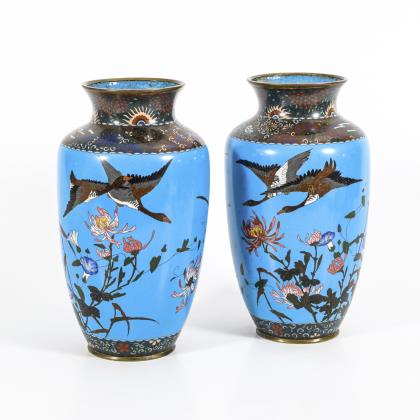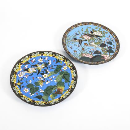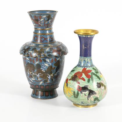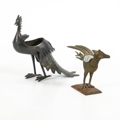 Bronze-Pfau mit langen Schwanzfedern in Champlevétechnik, den Korpus als Schale geformt, der Schweif ist beweglich. H 30 cm, L 31 cm. / Kleinerer Vogel auf Holzsockel, Oberfläche mit Fadenauflage, Federkleid auf dem Rücken als Deckel in Cloisonnétechnik geformt. H 19,5 cm, L 28 cm