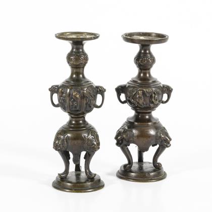 In der Form sehr ähnliche Leuchter. Dreifüßig, auf runder Plinthe mit Relieffeldern