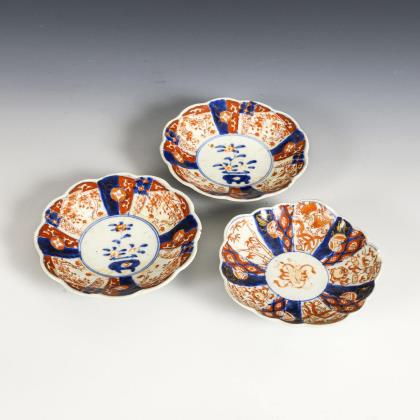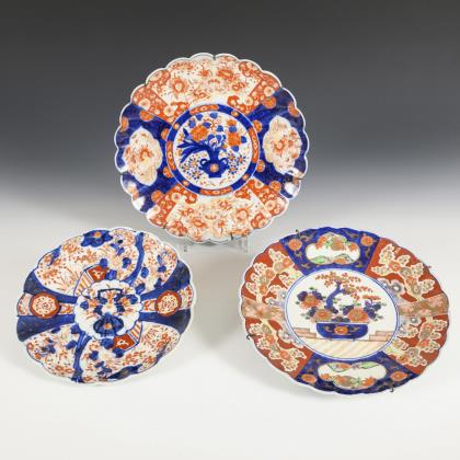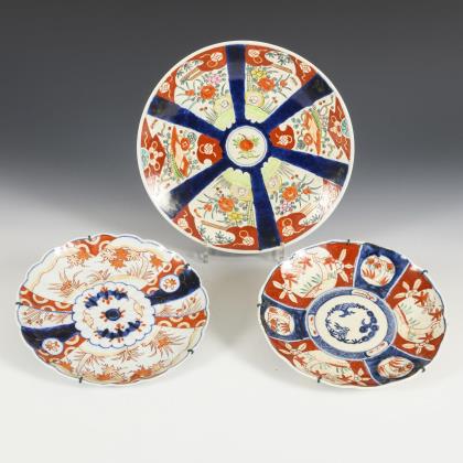 Alle mit gewelltem Rand. Ein Paar, beide mit Haarrissen auf der Unterseite, einer mit Randchip. Ø 15 cm. / Einzelner Teller, gemarkt, mit Chips an Rand und Fußring. Ø 14 cm