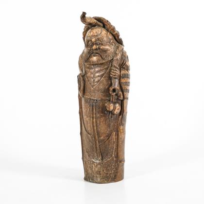 Darstellung einer mythologischen Figur. Als Attribute Stab mit Kürbisflasche, Beutel sowie großes Blatt als Kopfschutz und hervorstehende Brustrippen