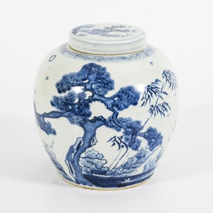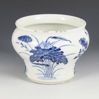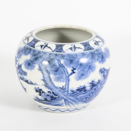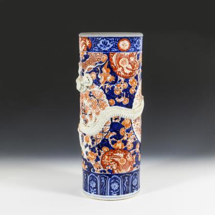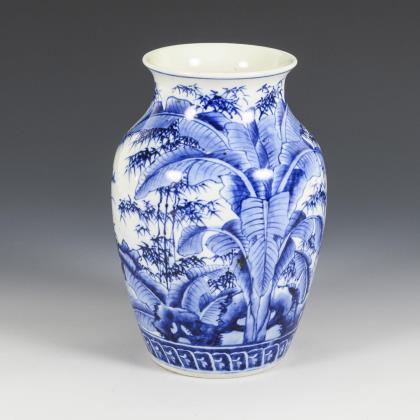 Balustervase mit drei stilisierten Blütenbäumen (Kirsche, Kiefer und ?), unten durch Bambuspflanzen ergänzt. Unterglasur-Blaumalerei, mit Gold, Grün und Rot ergänzt