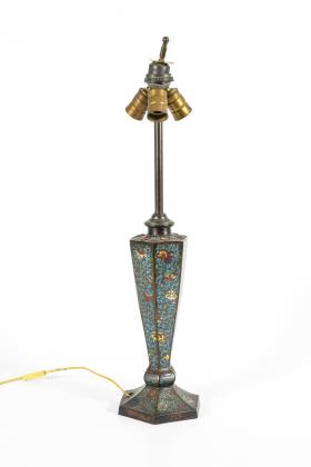 Aufwändig gestalteter Korpus mit feiner Rippung, die Rippen jeweils unterschiedlich gemustert. Zwei Bildkartuschen mit Blumenelementen sind glatt und von der Rippung ausgenommen. Meatllmontierungen, wohl als Lampenfuß konzipiert