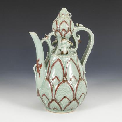 Einer Pflanze nachgeformtes Gefäß mit Seladonglasur, fein krakeliert. Henkel und Tülle durch feine Ranken und Blattwerk verbunden