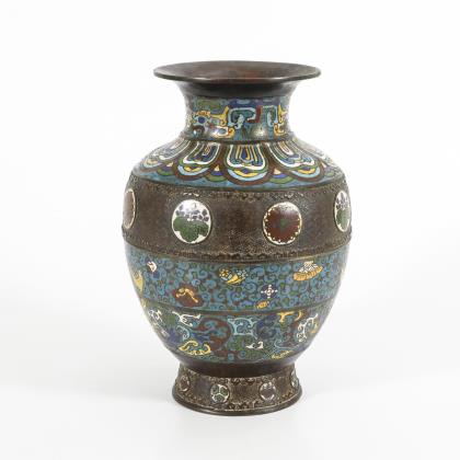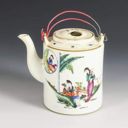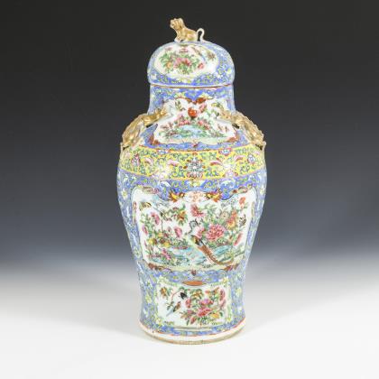 Polychrome Malerei mit farbkräftigen Emailfarben. Bildkartuschen mit Blumen- und Vogelmotiven, umgeben von reichem Rankenmuster. Drachenförmige, flache Handhaben