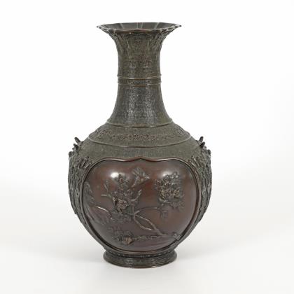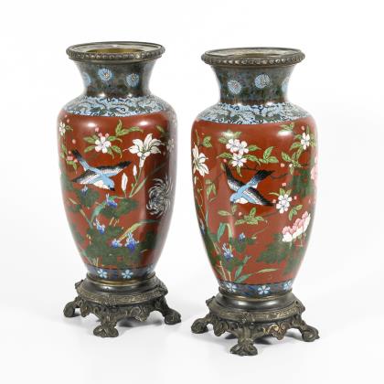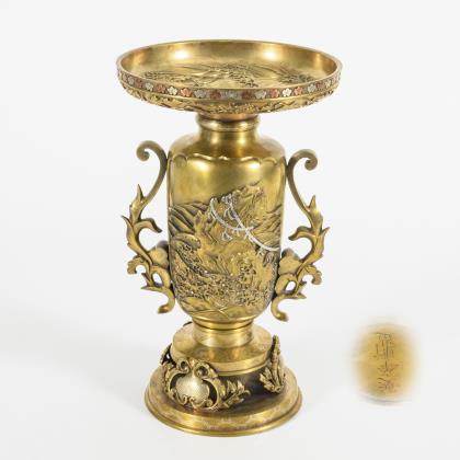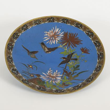Vögel zwischen blühenden Zweigen, Chrysanthemen, Päonien und Winden, auf braunem Grund. Metallmontierung als Fuß und Randfassung mit vertieftem Einsatz