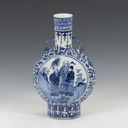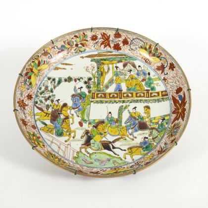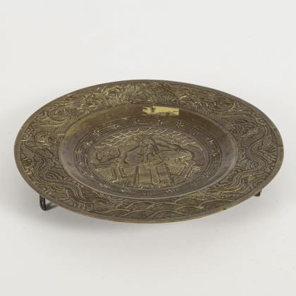 Reliefierter Teller mit Gelehrtenfigur im Spiegel und Drachenornament auf der Fahne. Rückseite mit angesetzten Metallösen