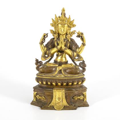 Auf geschmücktem Sockel und Lotosthron sitzende, vierarmige Figur, im Verschränkungssitz. Mit dem mudra der Verehrung (oder 'halten des Juwels') und in den anderen Händen Blüte und Schlinge haltend. Sockel seitlich mit Löwenapplikationen verziert. Gute Verarbeitung, rückseitig Halterung für fehlenden Aurakranz und ein Haken