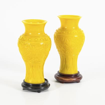 Zwei durchscheinende Opalglasvasen in Balusterform, mit reliefiertem Drachenfries, auf jüngeren Holzsockeln