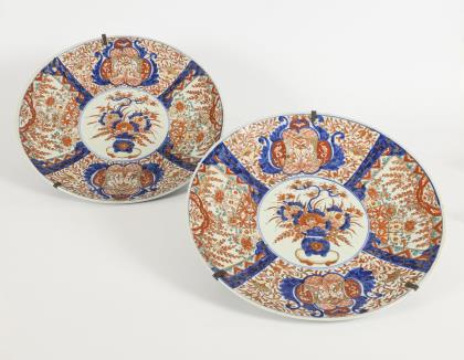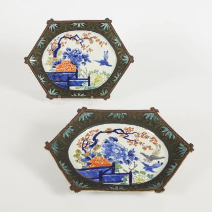 In der Art der Satsumaware. Beide mit vielfigurigen Heiligendarstellungen in angedeuteter Landschaft. Einmal entspricht die Randform des Tabletts einem Pfirsich mit plastischen Blättern und Stiel. Bei dem anderen Stück ist der Rand als Bambus geformt. Unglasierte Unterseite leicht unregelmäßig, wie mit Fingern flach gedrückt. Beide mit Wandhalterungen