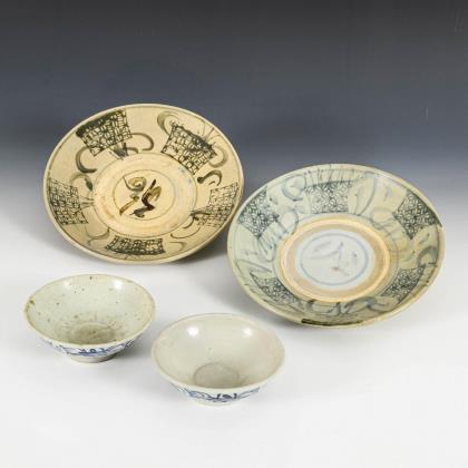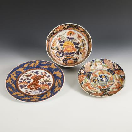 Schüssel mit Aufglasurmalerei: Vögel auf Vase mit Päonienblüten, H 11, Ø 25 cm. / Teller mit gewelltem Rand, Unterglasurblau und Aufglasurmalerei mit Pferden, Unterseite mit Blüten. Ø22 cm. / Teller mit Emailmalerei(?), Fo-Hund zwischen Blüten und Blättern. Ø 27 cm