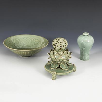 3 Seladonteile - Weihrauchbrenner, kleine Meipingvase und Schale.