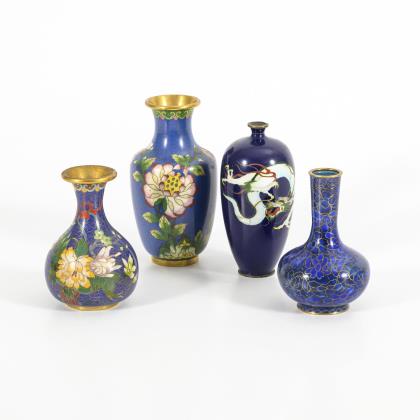Alle mit Messingkorpus, die drei kleinen Vasen mit blauer Innen-Emaillierung. Tief reliefierter Rotlack mit Pflanzen- und Landschaftsdarstellungen