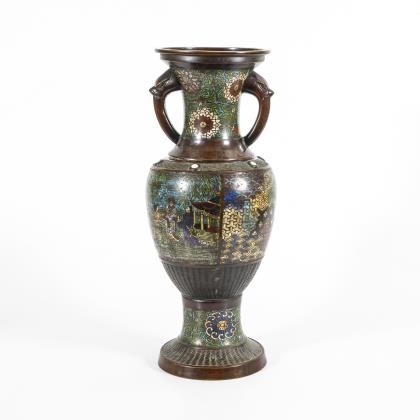 Balustervase mit drei breiten Schmuck- und Bildfriesen. Fuß und Unterteil mit optischem Flechtmuster. Zweiteilig, Hals nur eingesteckt.