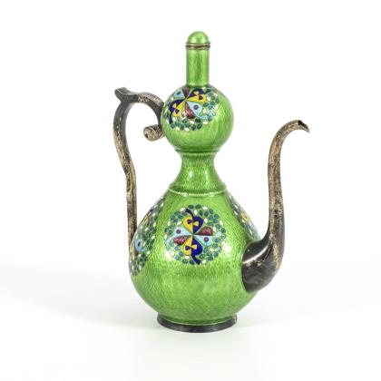 Silberkorpus mit grüner Transluzidemail dekorierte. Henkel und schlanke Tülle aus sichtbarem Silber