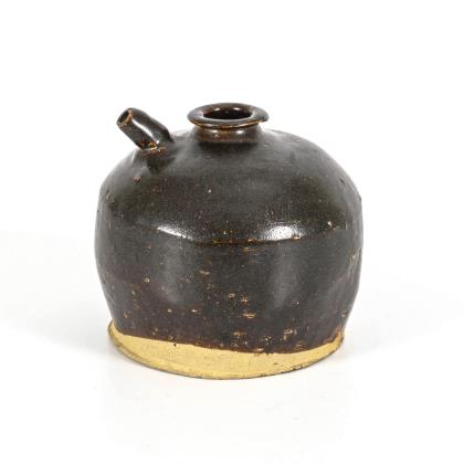 Dunkelbraune Glasur, unten auslaufend, unterer Rand unglasiert