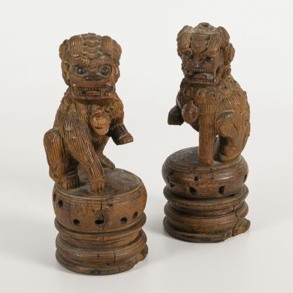 Gedrechselter Sockel und kunstvoll geschnitzte Palastlöwen aus einem Holzstück. Beide mit beweglicher Holzperle im Maul und erhobener Tatze. Ohne Ball und Jungtier. Unregelmäßige Lochung im Sockel
