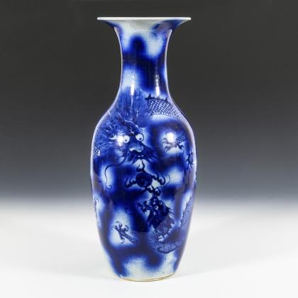 Schlanke Form mit unglasiertem Flachrelief zweier Drachen mit Kugel