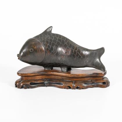 Karpfen in schwimmender Bewegung, auf passendem Holzsockel