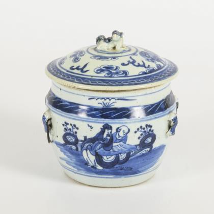 Tropfenförmige Wandung mit ausgestelltem Rand. Umlaufend: bewaffneter Krieger zu Pferd; Alter Mann im einachsigen Wagen mit Gepard und Tiger als Zugtiere; Krieger zu Fuß, alle in angedeuteter Landschaft