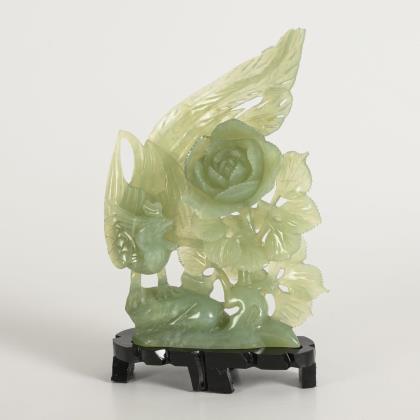 Phönix mit großer Blüte aus hellgrüner Jade, mit Holzsockel