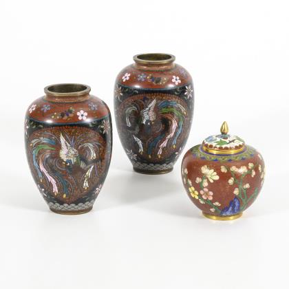 Fußschale mit feinteiliger Landschaftsdarstellung auf dem Deckel. H 13,5 cm; Ø 15 cm. / 2 Väschen in rot-schwarz. H 12,5 und 13 cm. Alle innen blau emailliert