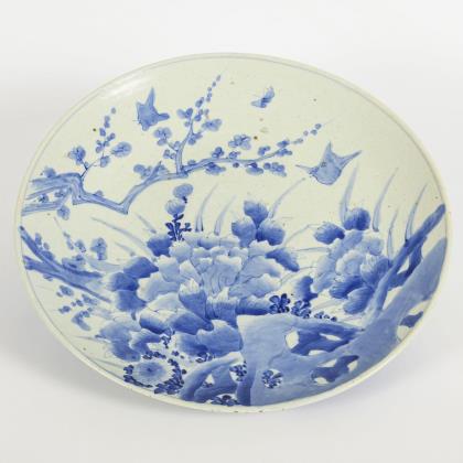 Große Schale mit Chrysanthemendekor und runder Kartusche mit Pfauenpaar in Landschaft. Unterseite mit Glyzinien. Gemarkt. / Kleiner Teller mit Heiligendarstellung in dichter Bemalung. Unterseite mit sehr feinem Krakelee und dezentem Ornament