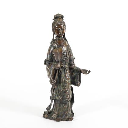 Stehende Heiligenfigur mit Schmuckelementen und hoher Kopfhaube. Auf der Gewandrückseite Schriftzeichen für "langes Leben". Auf doppeltem Lotossockel, dieser an der Rückfront mit Kleeblattöffnung und zwei seitlichen Tüllen für weitere Elemente. Figur aus mehreren Teilen zusammengefügt, Sockel abnehmbar