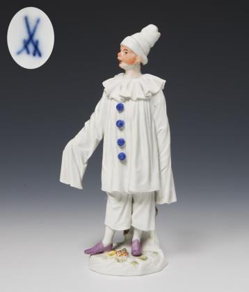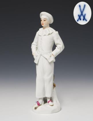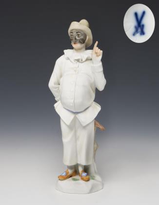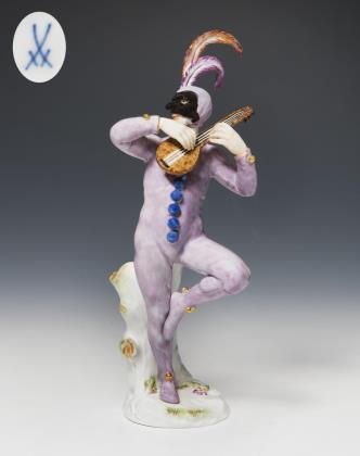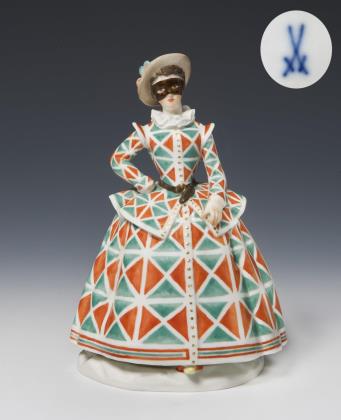 Modell-Jahr: 1922, Pendant zu Modell-Nr. 1 "Harlekin mit Flöte". Farbig bemalt, gold staffiert, Ritzmarke, Pressmarke, Schwertermarke mit Punkt viermal gestrichen, Künstler-Signet